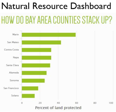 A graphic containing a headline of Natural Resource Dashboard, followed by the question of, how do Bay Area counties stack up? Below that is a bar graph showing percent of land protected by county. The counties are, in order, Marin, San Mateo, Contra Costa, Napa, Santa Clara, Alameda, Sonoma, San Francisco, and Solano.
